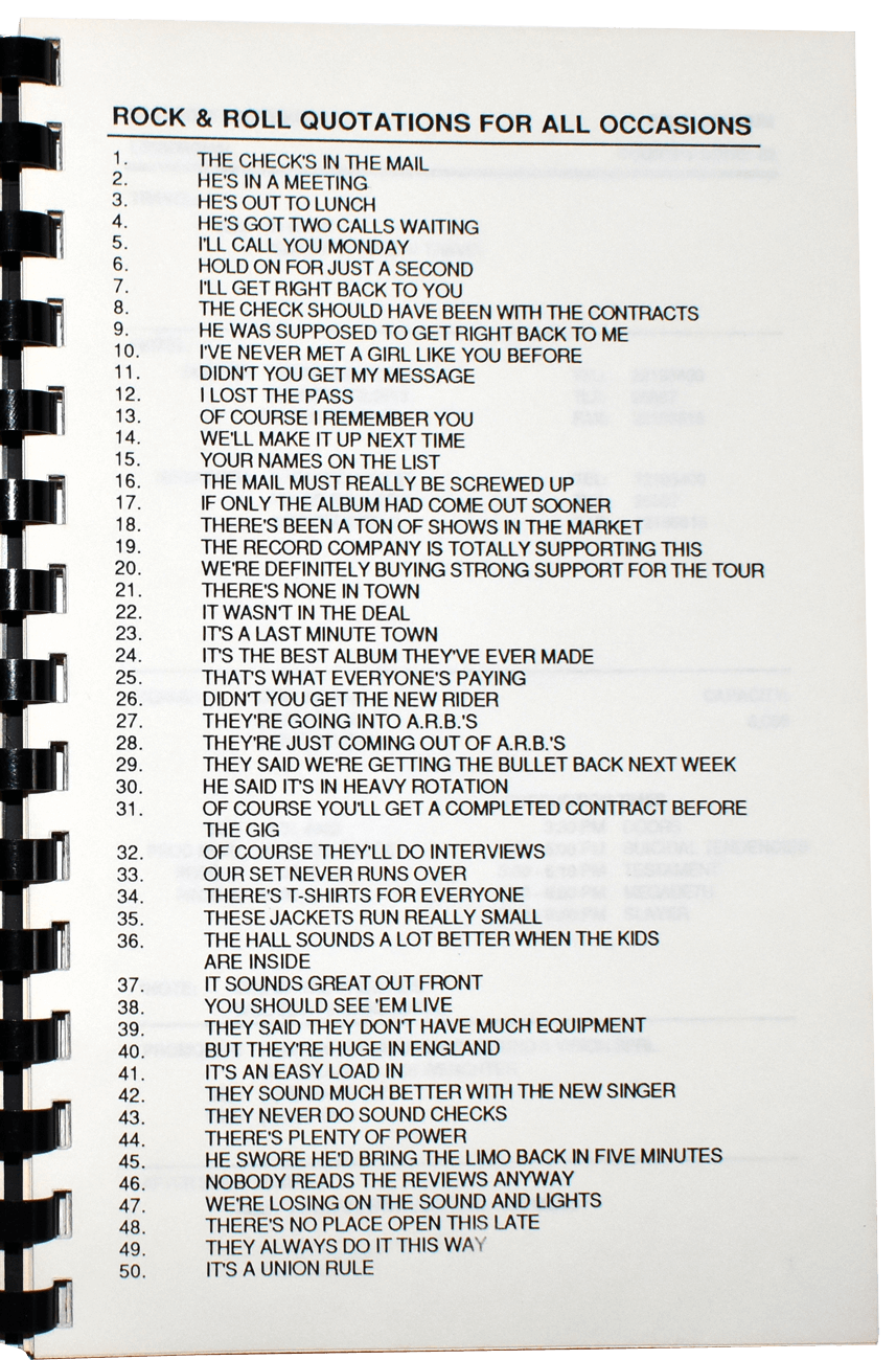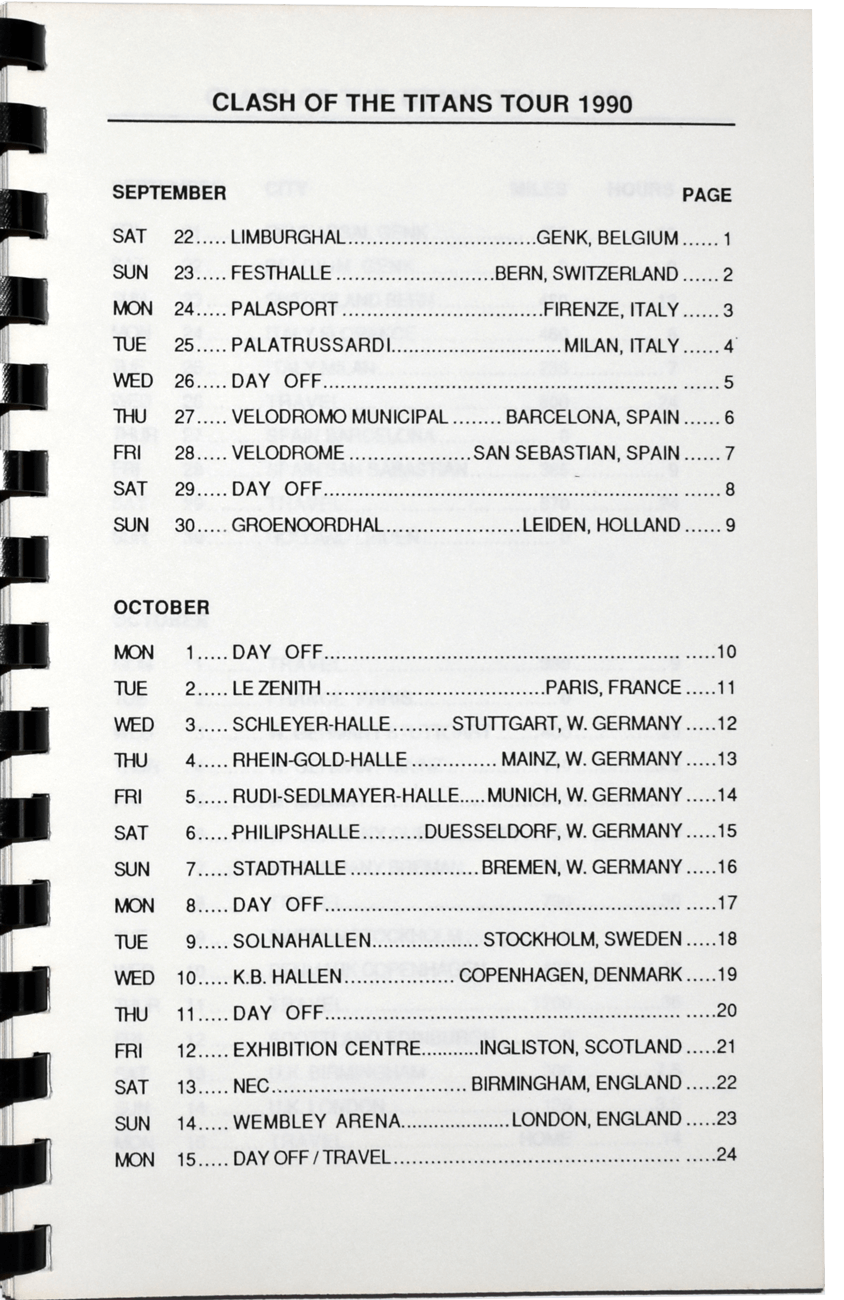 1-3. Tom Araya's Clash of the Titans Tour itinerary covering September and October 1990. The itinerary book also includes a page of "Rock and Roll Quotations for All Occasions," such as "It's an easy load-in," and "Nobody reads the reviews anyway." From the Collection of Tom Araya