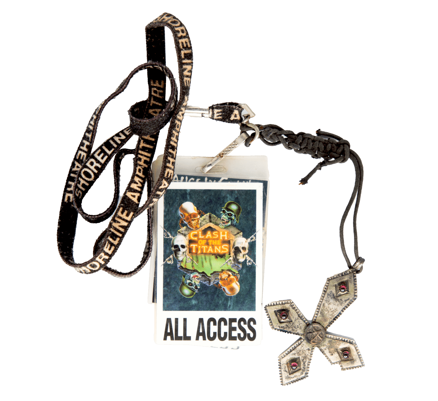 5. Tom Araya's laminated pass for the Clash of the Titans Tour, 1990. The pass has a cross tied onto the Shoreline Amphitheatre lanyard. From the Collection of Tom Araya