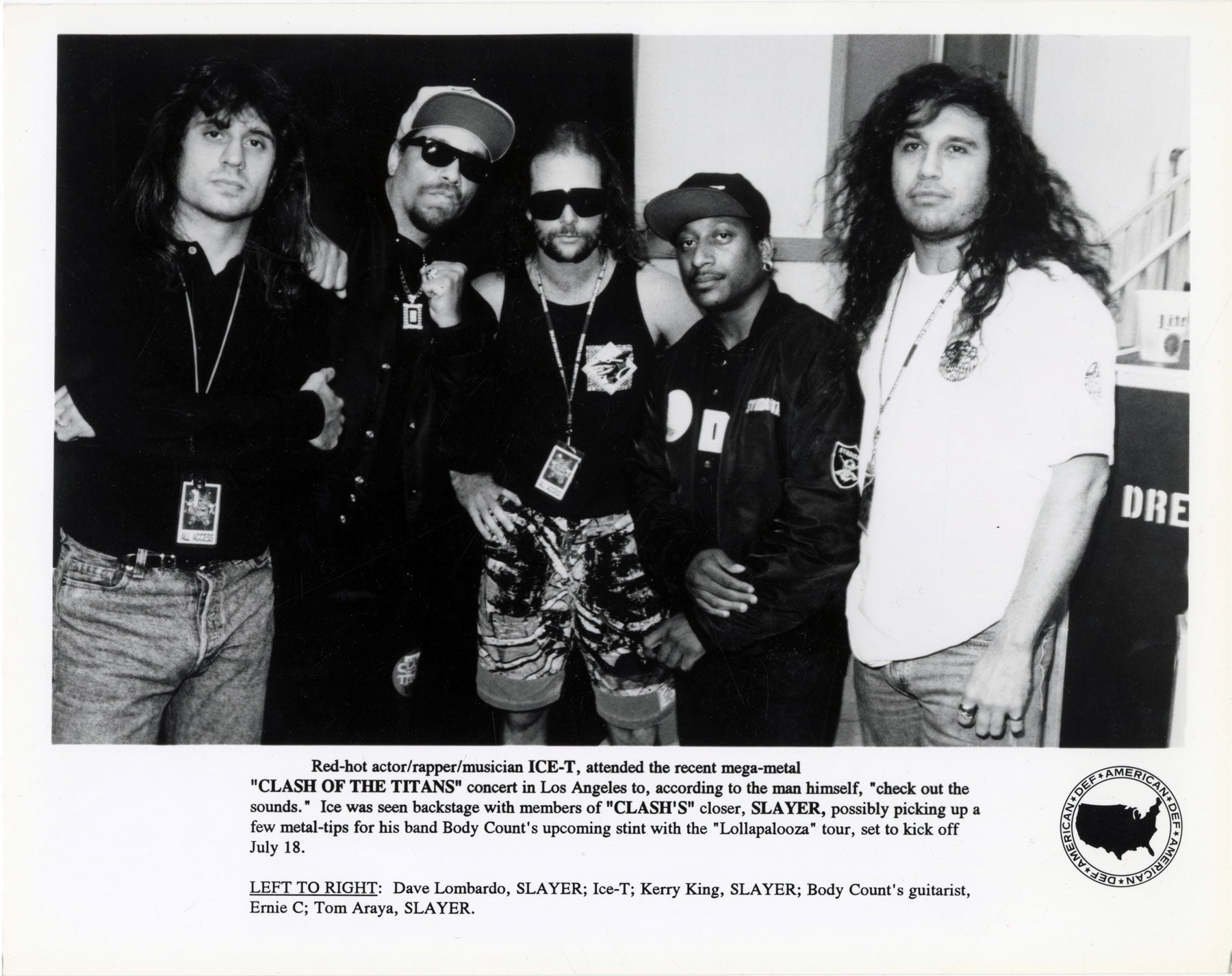 14. Def American promotional photo of Dave Lombardo, Kerry King, and Tom Araya with Ice-T and Body Count guitarist Ernie C at the Pacific Amphitheatre, Costa Mesa, California, May 25, 1991. Slayer would later collaborate with Ice-T on a cover of The Exploited's "Disorder" for the Judgement Night soundtrack. From the Collection of Rick Sales