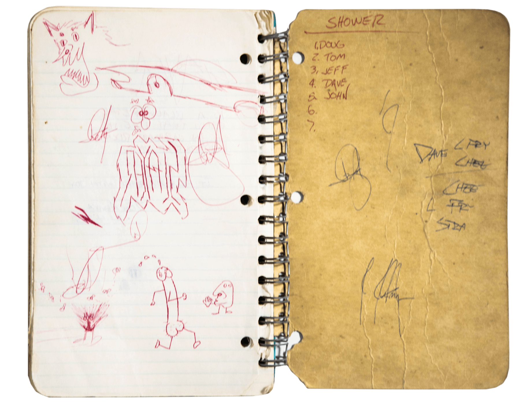 By the final pages of this tour journal, a fuller picture of Slayer begins to take shape as a unit surviving the grind of the road. The days were long, the margins tight, the wins hard-earned, and the fans growing exponentially in size and ferocity. A handwritten shower list puts people in order for bathroom access (Kerry recalls he was often staying with friends). The opposite page is filled with the kind of drawings you’d expect from guys barely out of their teens and venturing into the world outside of home.