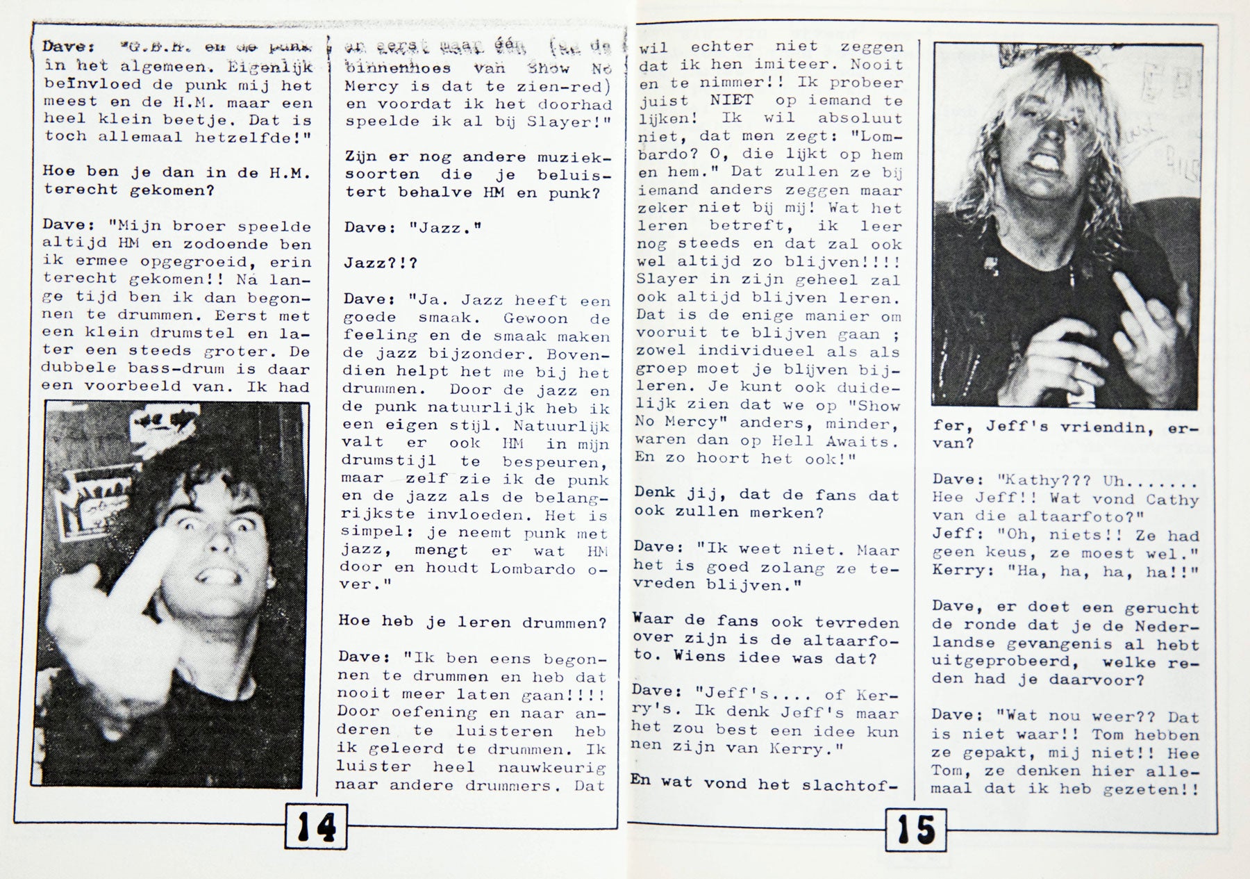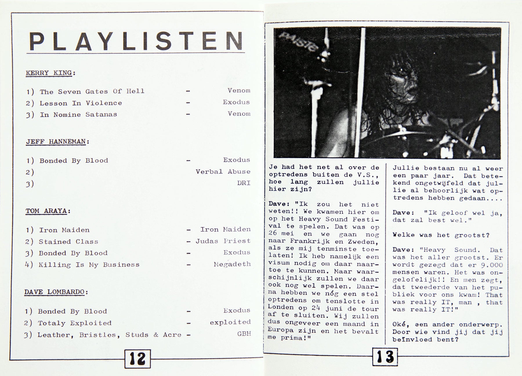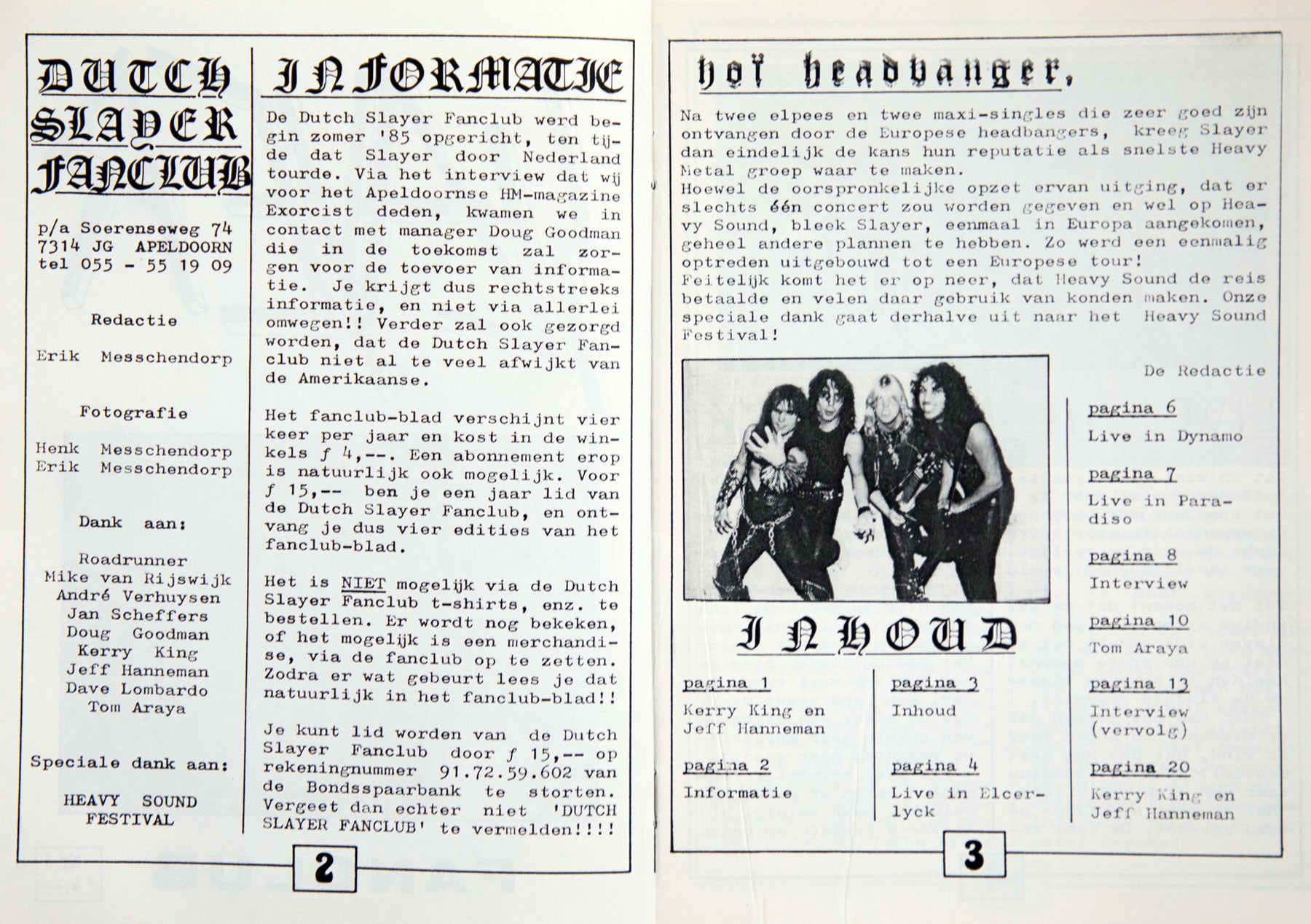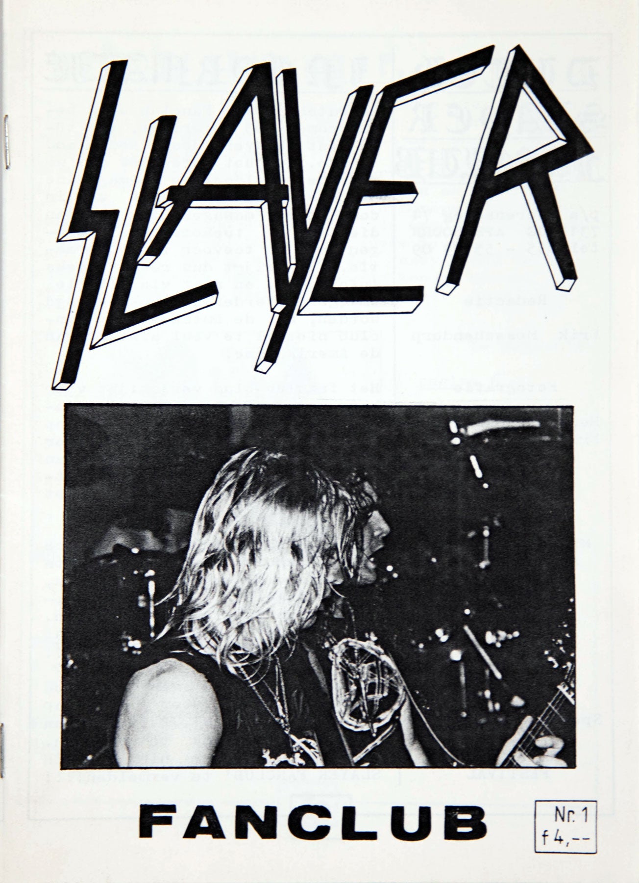 2-7. Published out of Apeldoorn, Netherlands, the 1985 Dutch Slayer Fanclub zine is one of the earliest examples of Slayer’s international community organizing itself into something tangible. The issue includes interviews, concert reviews from Slayer’s first major European dates, and handwritten playlists from each member. One gig recap calls Slayer's performances "borderless," saying, "Slayer always gives everything. Every show is an experience." From the Collection of Doug Goodman