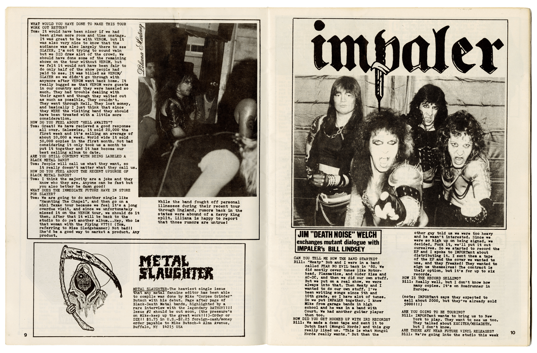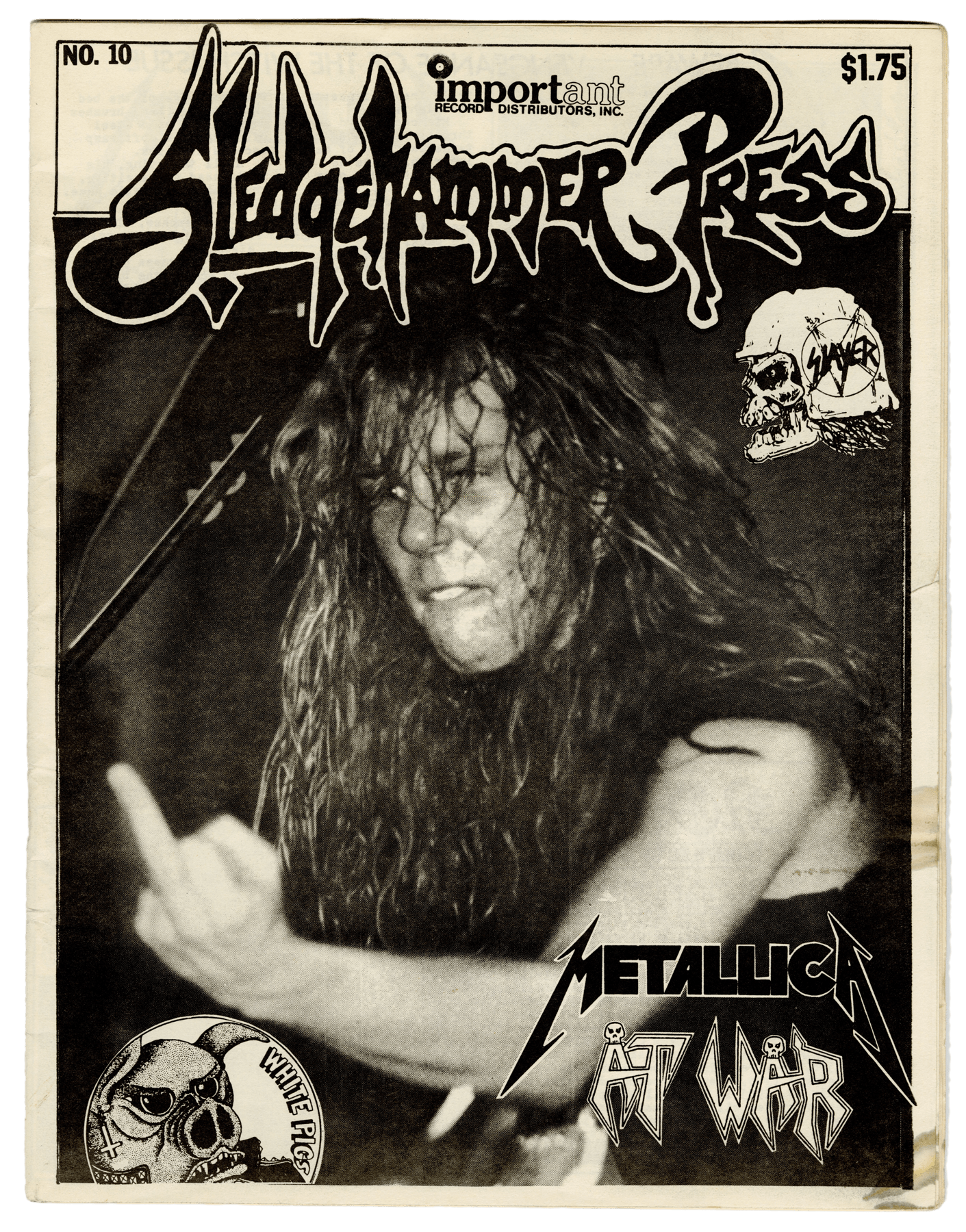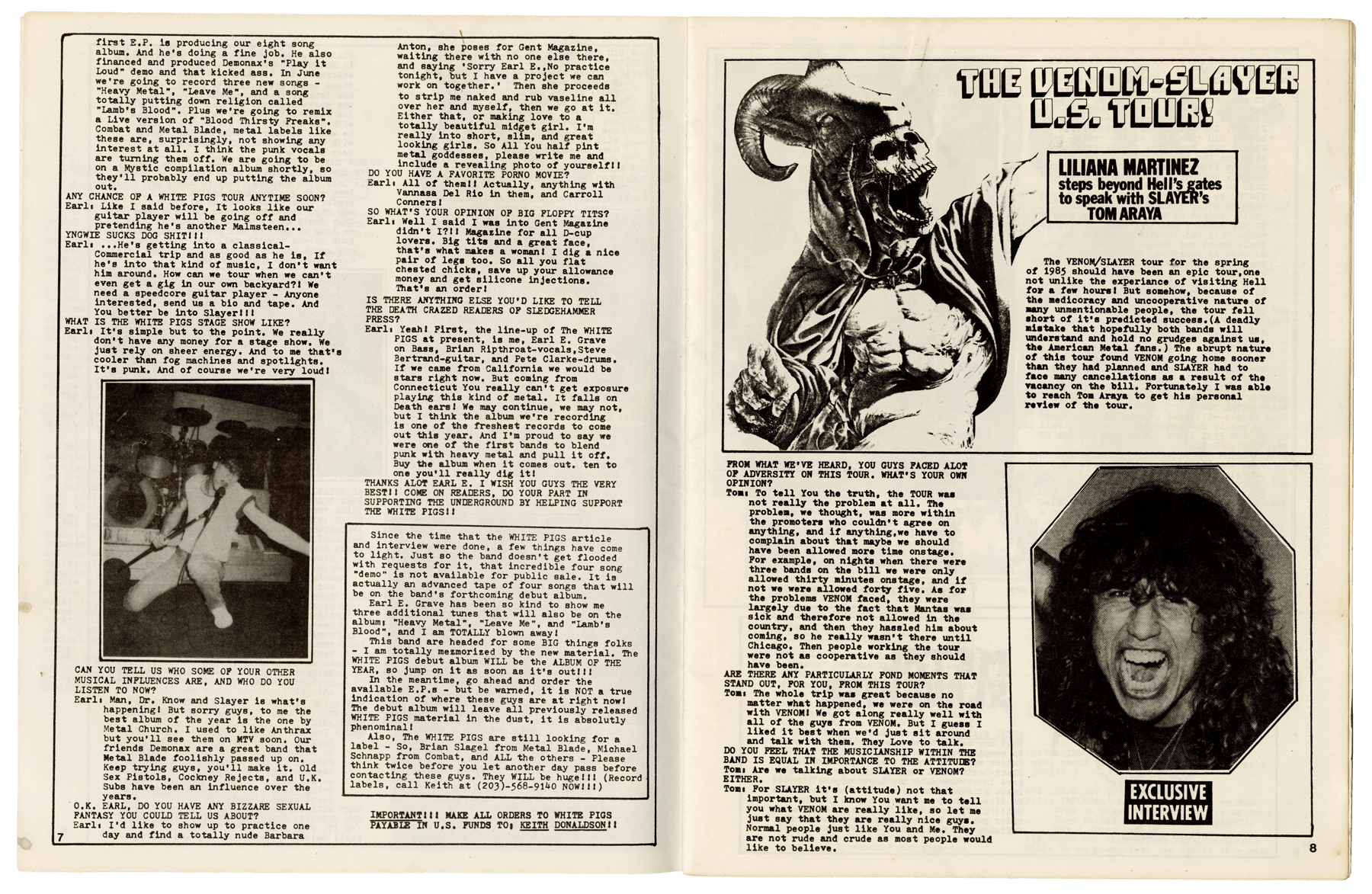 8-10. Issue 10 of U.S.-based fanzine Sledgehammer Press features a full interview with Tom Araya about the challenges and triumphs of the Hell Awaits tour. Araya speaks candidly about limited stage time, the band’s growing fanbase, and the sales success of Hell Awaits. “It sold 50,000 copies worldwide,” he says. “Not bad considering it only took a month to do.” From the Collection of Kerry King