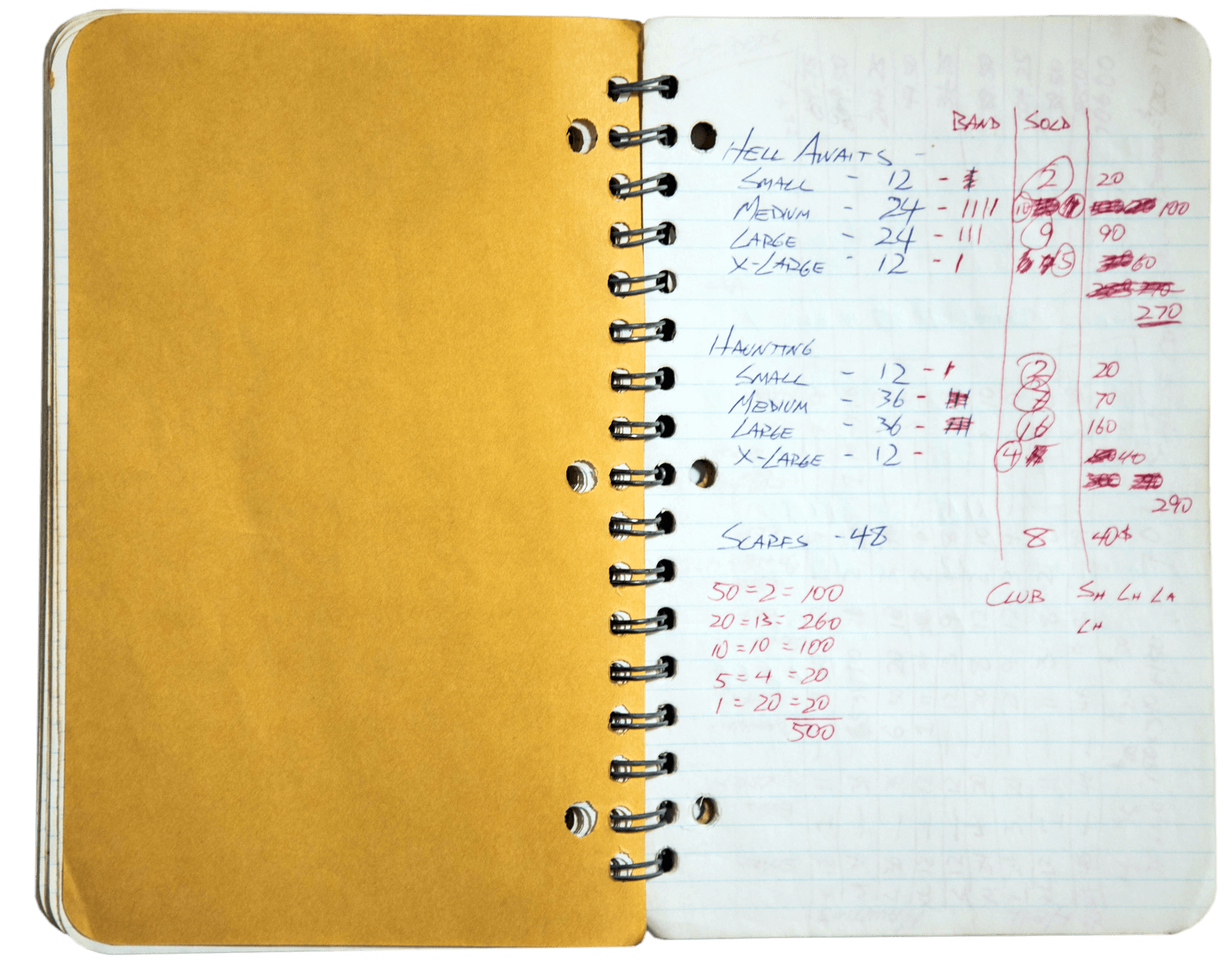 This notebook page offers a look into the growing operation behind Slayer’s 1985 tour, documenting detailed merchandise sales for Hell Awaits and Haunting the Chapel shirts, sleeveless sweatshirts, and scarves. Broken down by size, quantity, and units sold, this kind of accounting reveals the band managing the logistics of an increasingly dedicated following.