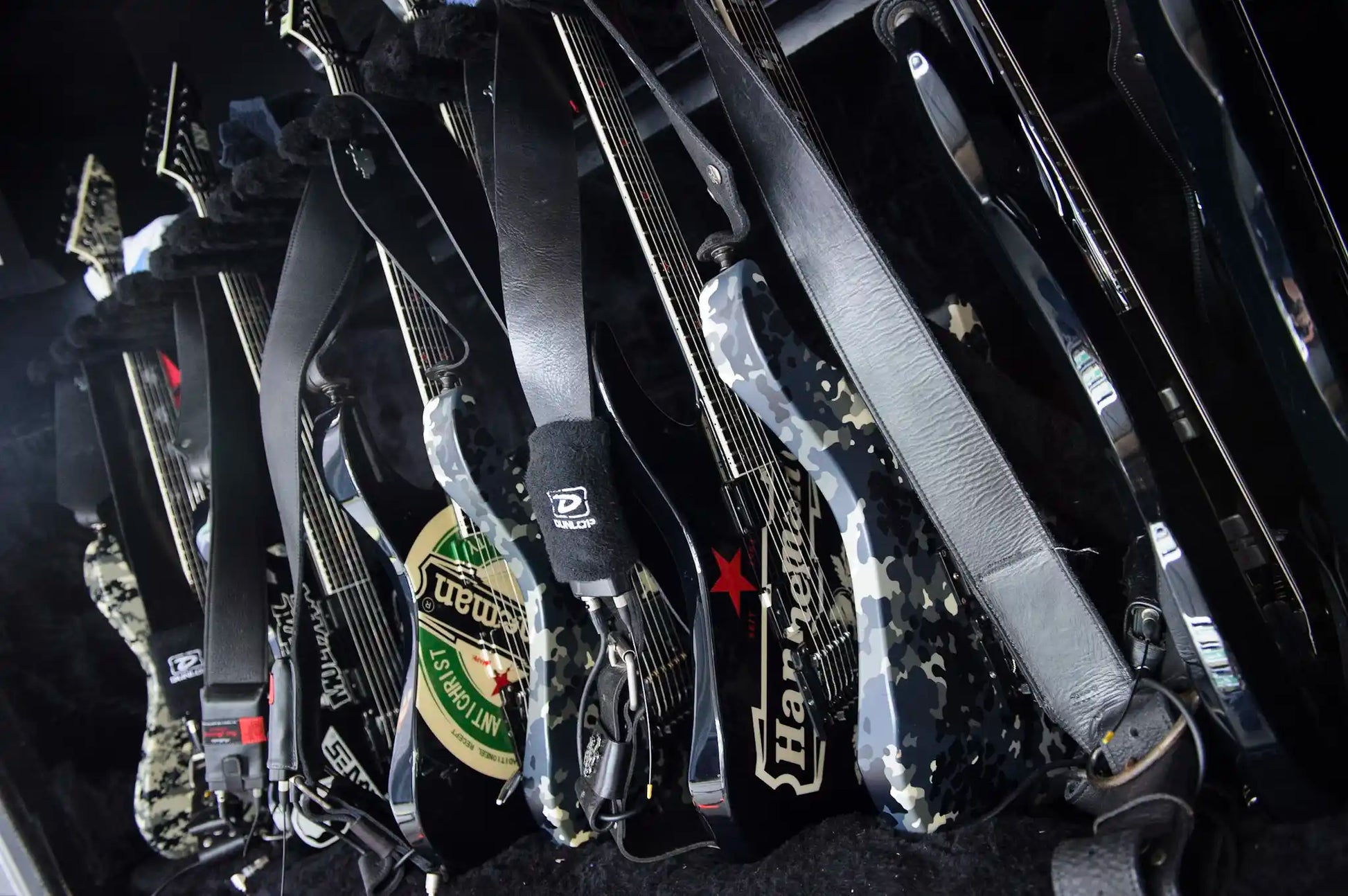 Jeff Hanneman's guitar rack in the wings of the venue.