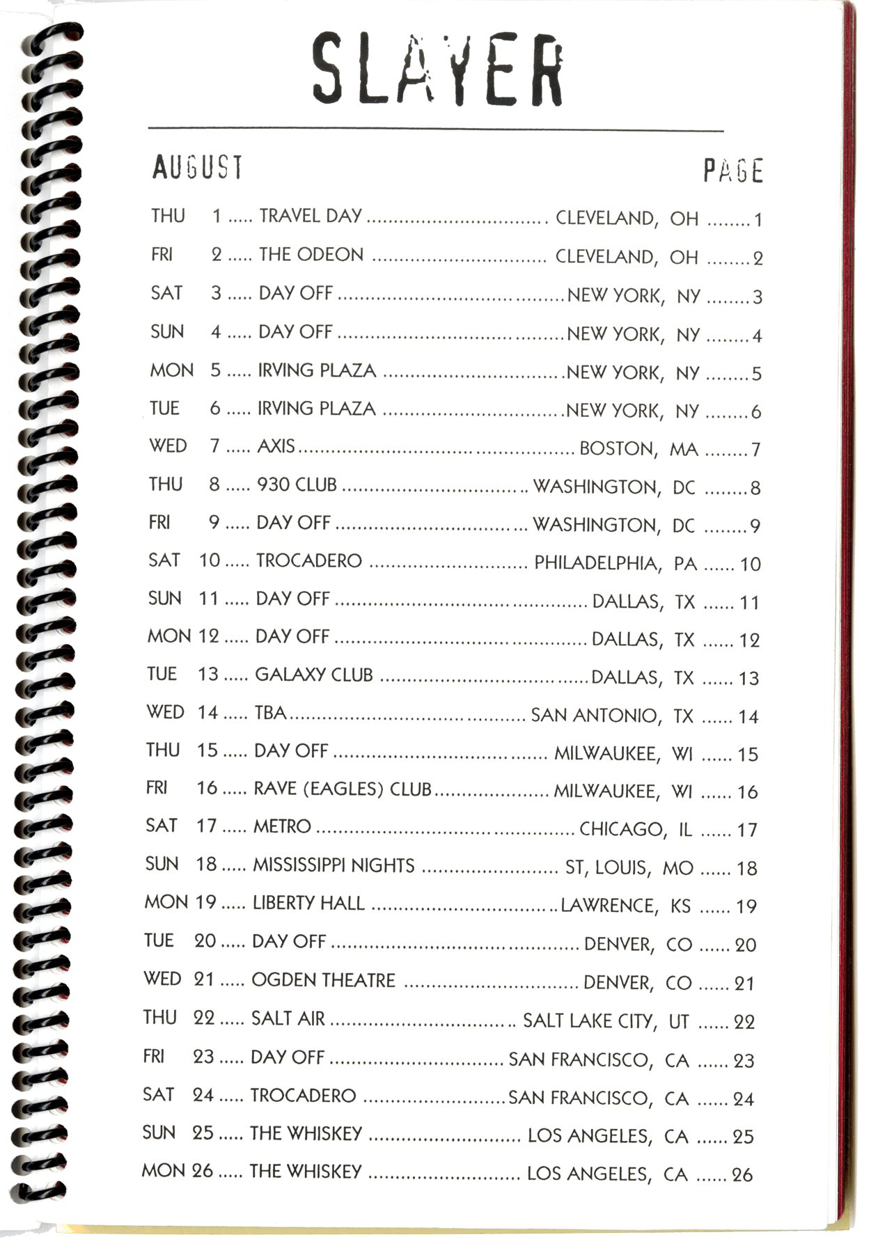 7-8. Kerry King's personal Tour itinerary from Slayer's Undisputed Attitude U.S. Club Tour, 1996. From the Collection of Kerry King