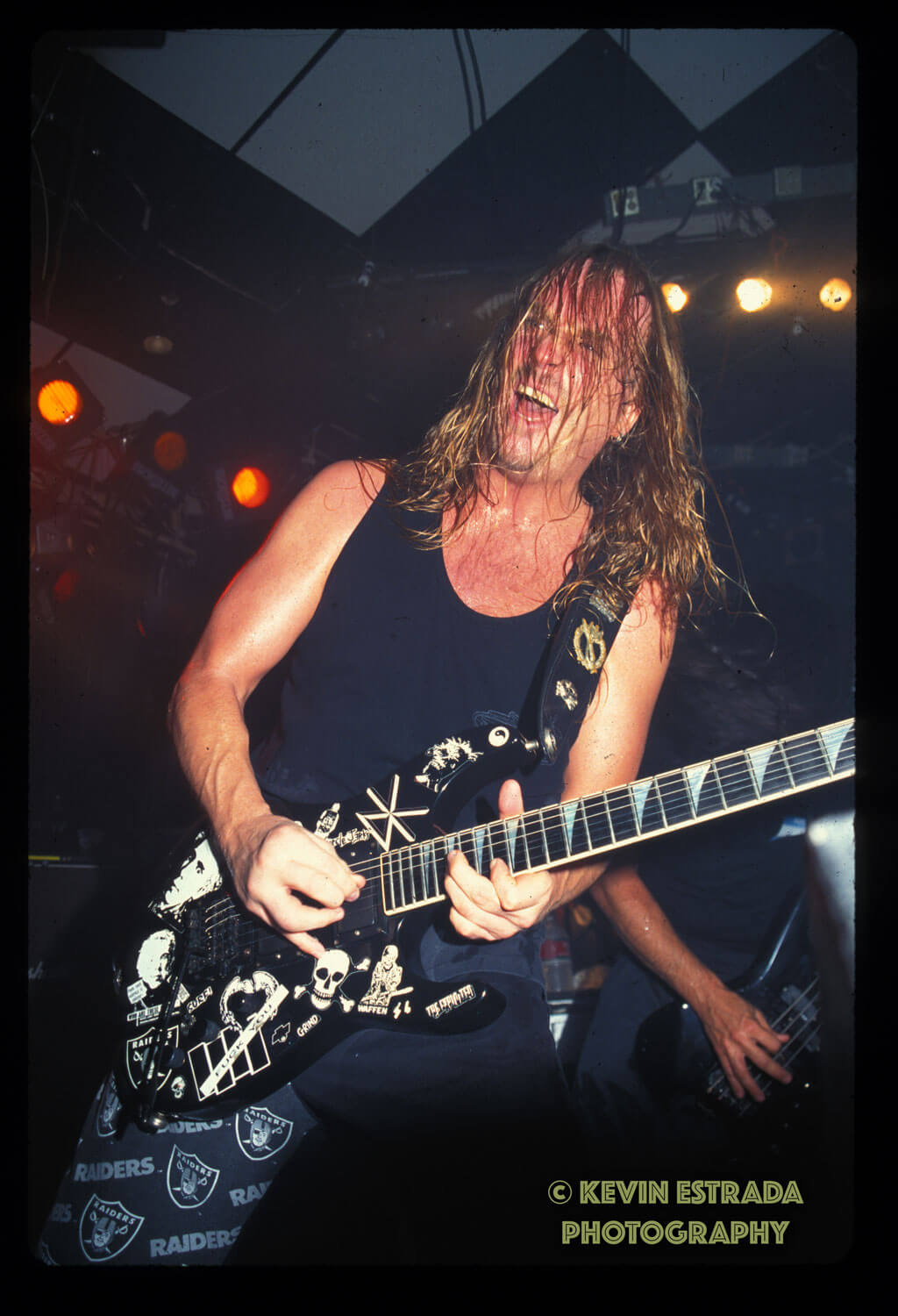 1-6. Behind-the-scenes and live shots of Slayer's show at the Whisky a Go Go, West Hollywood, California, August 26, 1996, in support of the Undisputed Attitude Tour. Note: Rocky George of Suicidal Tendencies is with Jeff in the backstage photo. Photos: Kevin Estrada From the Collection of Slayer